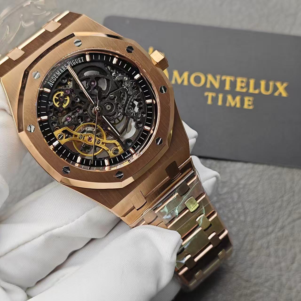 Case size: 41mm Dial: Open-worked dial Material: Rose Gold Plated Stainless Steel Movement: Exact Clone Movement Functions: Seconds, hours and minutes Hour Markers: Index Luminiscence: Hands and markers Water-resistance: 50 Meters Power Reserve: 48 Hours Extra-Thin Audemars Piguet royal Oak ref.15407 is high end mirror Copy and is exclusively available for sale…Do check out our in-house clicked video to see what will the watch look like when you receive it.