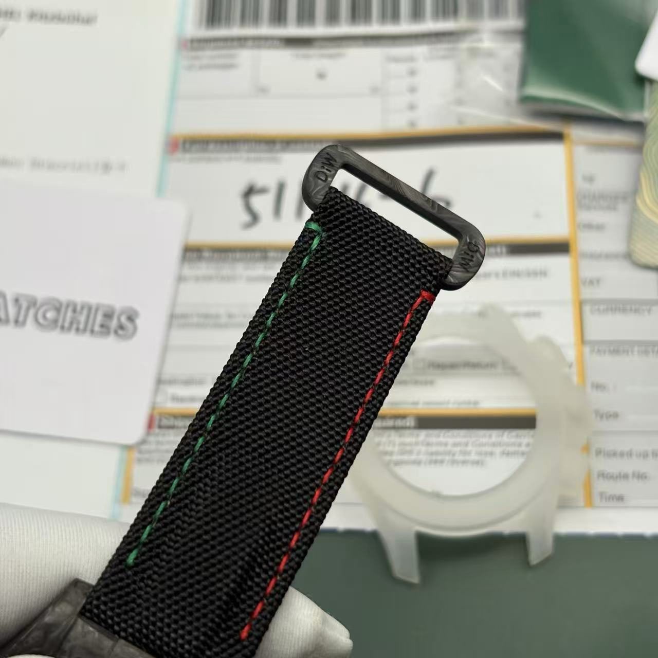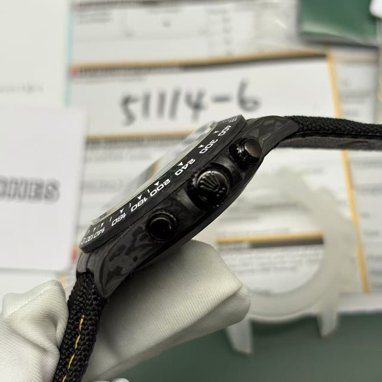 The diameter of the watch is 40MM, the same size as an ordinary Daytona. The entire case is made of carbon fiber, which is a new type of material. Its color is timeless black, and the overall texture is very elegant and luxurious. Carbon fiber is soft on the outside and strong on the inside. It is lighter than aluminum but stronger than steel and is corrosion-resistant. The matte black texture of the case is varied, and each carbon fiber watch will show different textures due to different cutting methods, making it unique. The strap is a Velcro design, made of nylon on the front, cowhide on the back, and the buckle is also made of carbon fiber.