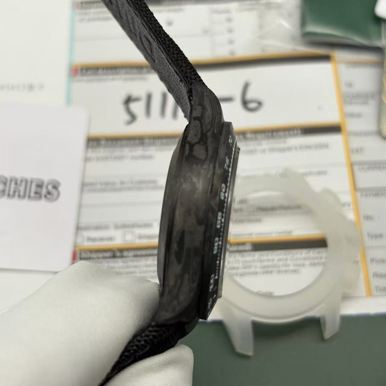 [Case] ​​Made of carbon fiber, it is light and comfortable to wear. Each watch has a unique carbon fiber pattern. Because carbon fiber is very hard, the case will suffer a lot of wear and tear during the CNC molding process!