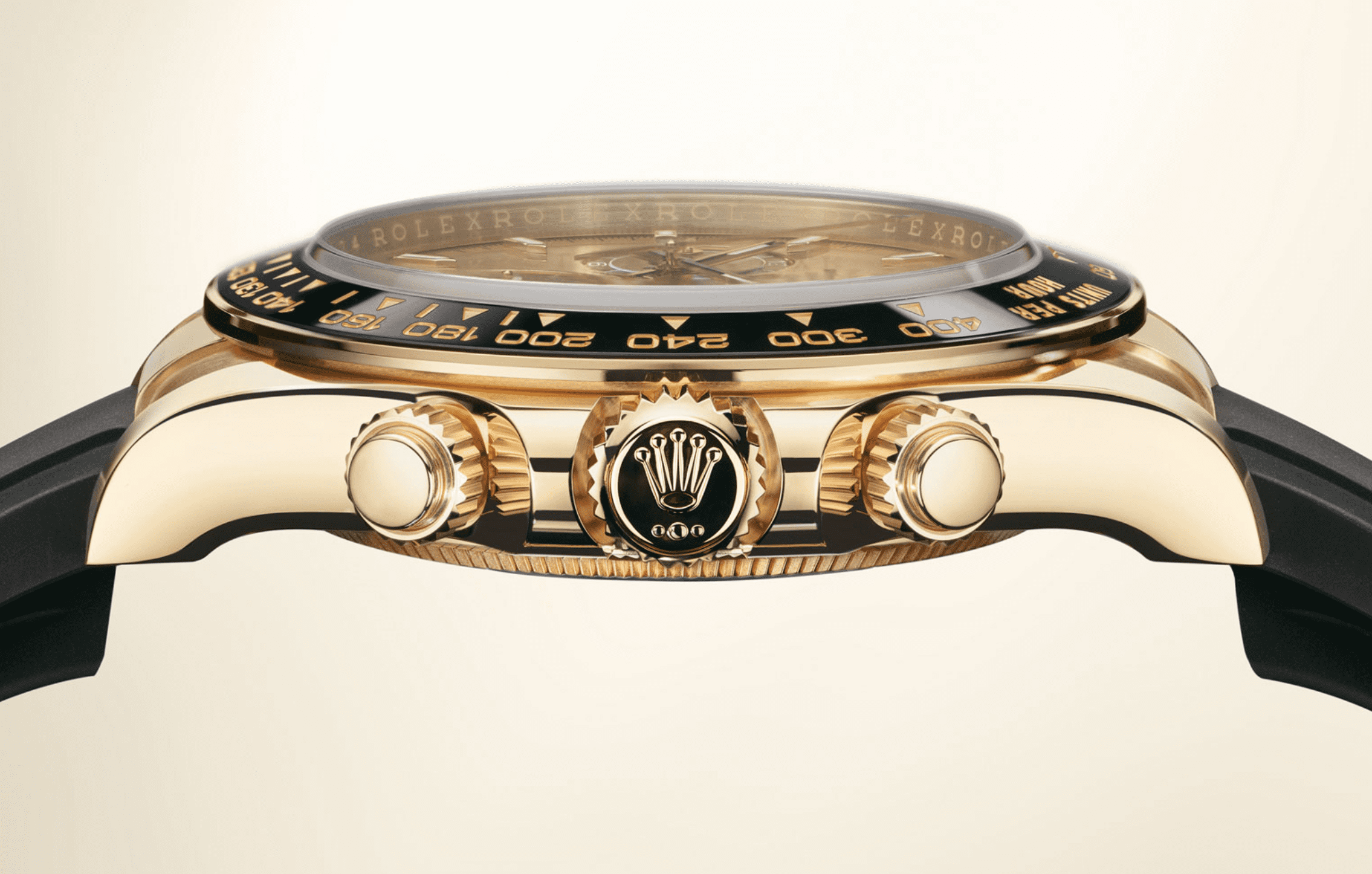 The new Daytona has a slimmer case, under 12 mm for the first time. Note the gold ring around the edge of the ceramic bezel.