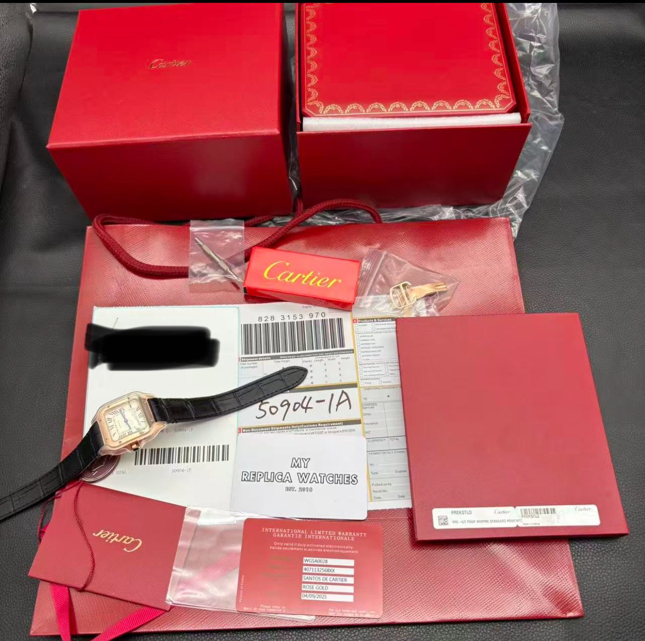 The Replica Cartier Santos WGSA0012 Watch is a high-quality 1:1 super clone of one of Cartier’s most recognizable designs. It features a solid 316L stainless steel case with a clean square shape, polished rose gold-tone bezel, and exposed screws — just like the original.
