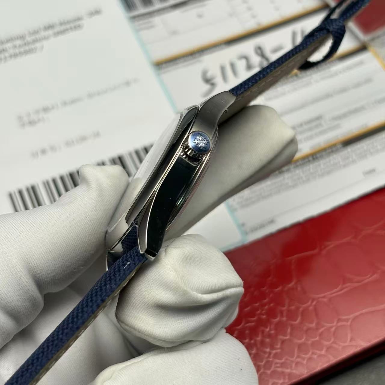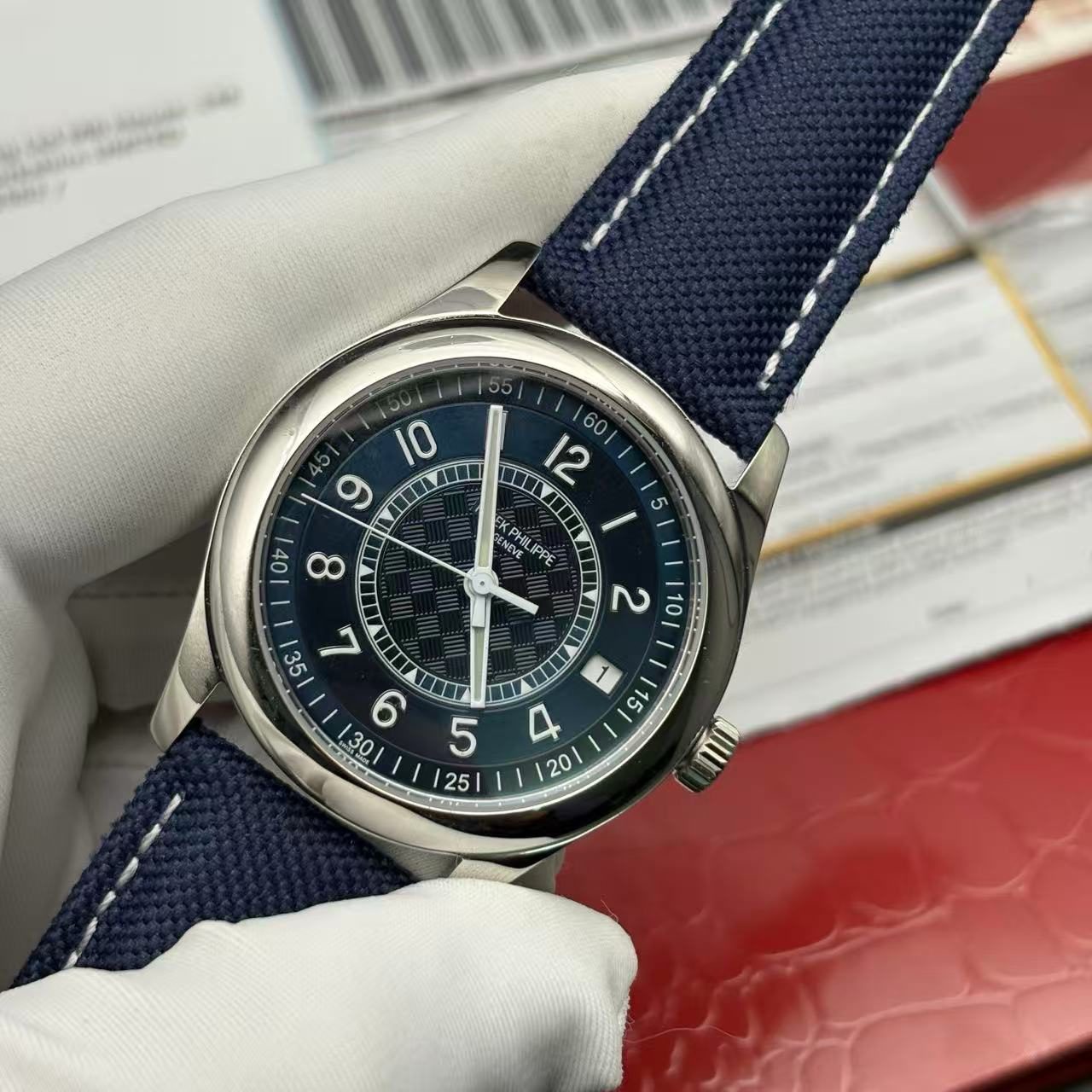 • Strap: Blue calfskin strap with white stitching and Patek-style buckle