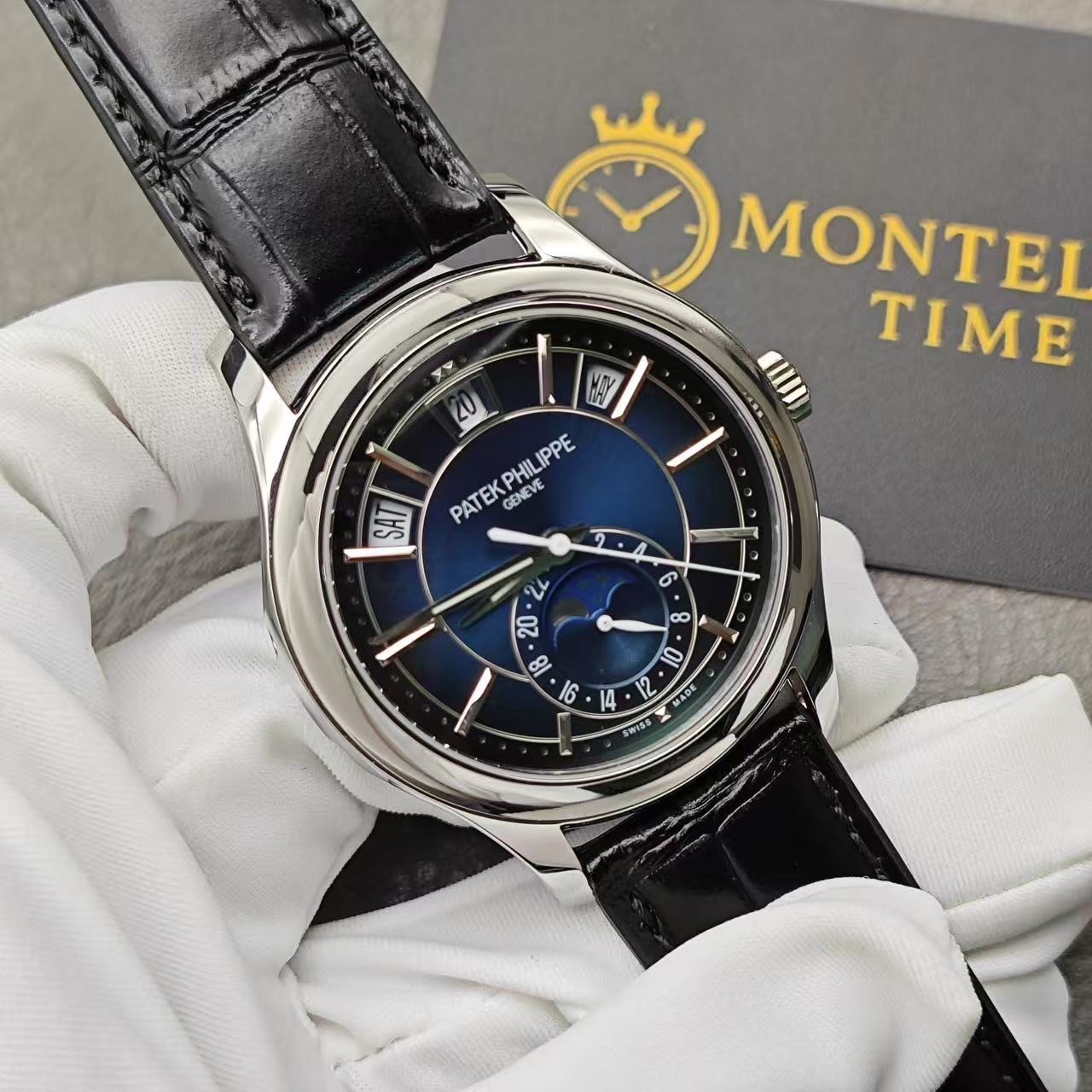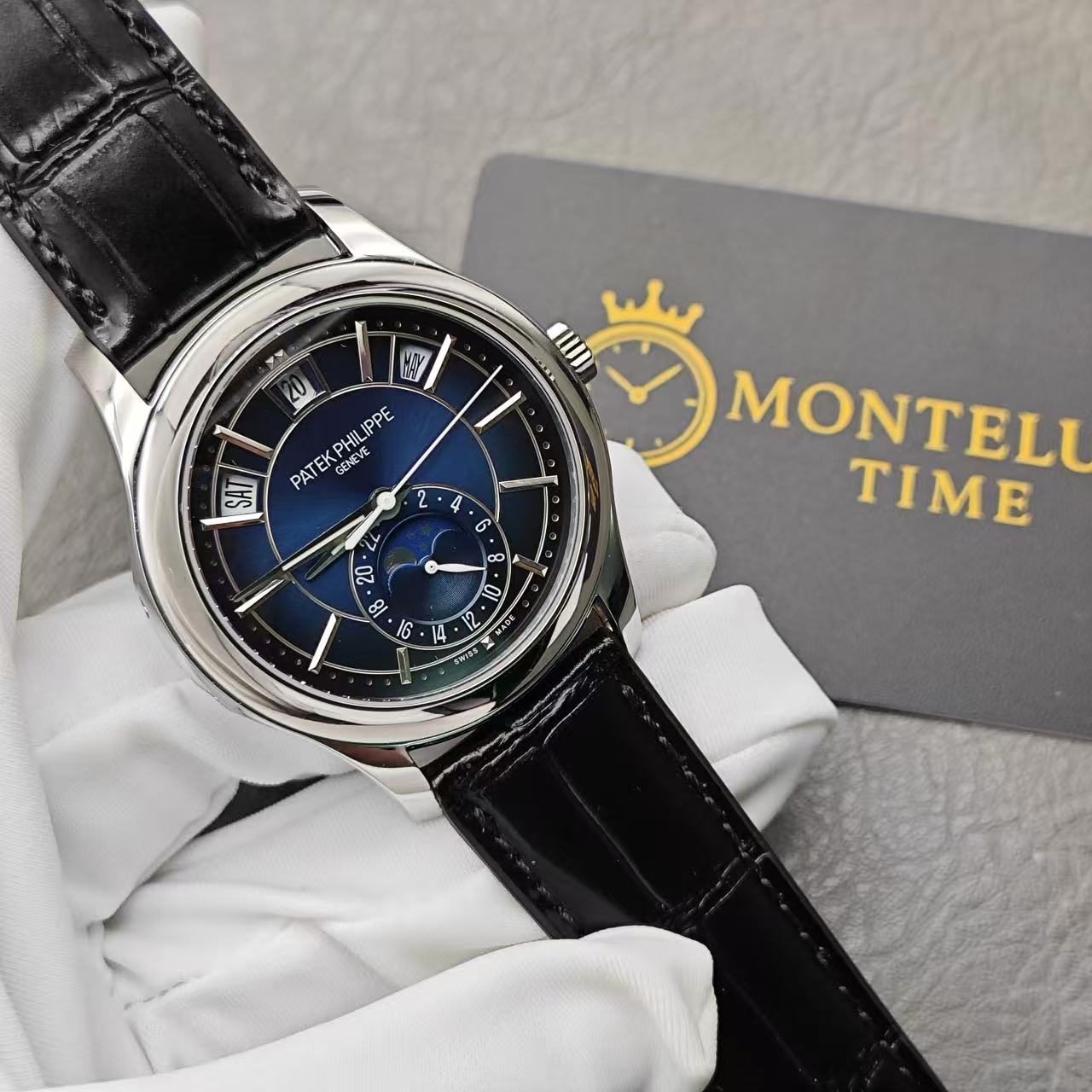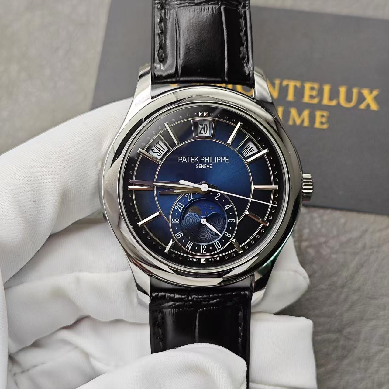 The 40mm white-gold–finished case offers a cool, elegant presence on the wrist. Its polished contours, ergonomic shape, and slim profile reflect the refined craftsmanship associated with the 5205 series. Sapphire crystal ensures long-term clarity and scratch protection.