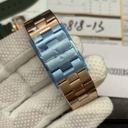 Crafted with 904L stainless steel and a luxurious rose gold finish, the case ensures both durability and an everlasting shine. The sapphire crystal provides exceptional clarity, offering an unobstructed view of the white dial, elegantly adorned with stick indices. The stainless steel hands move with precision, catching the light as they glide across the surface.