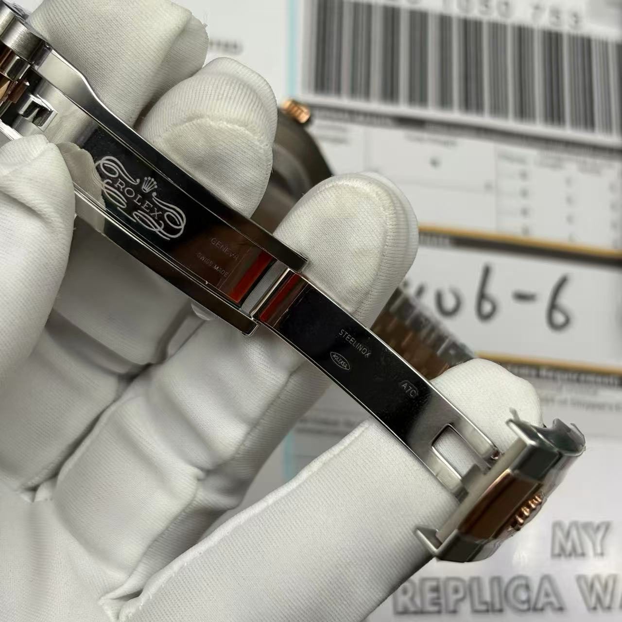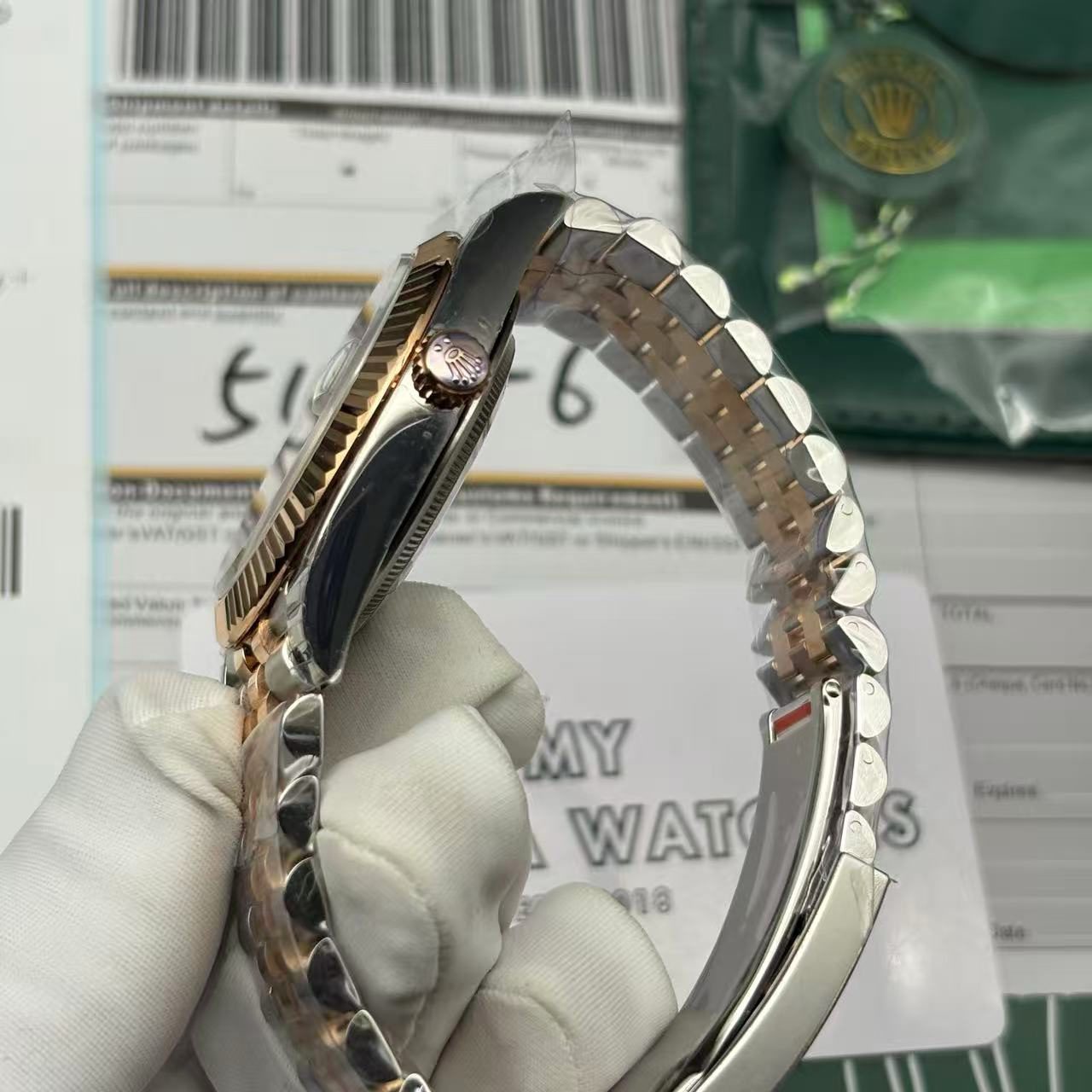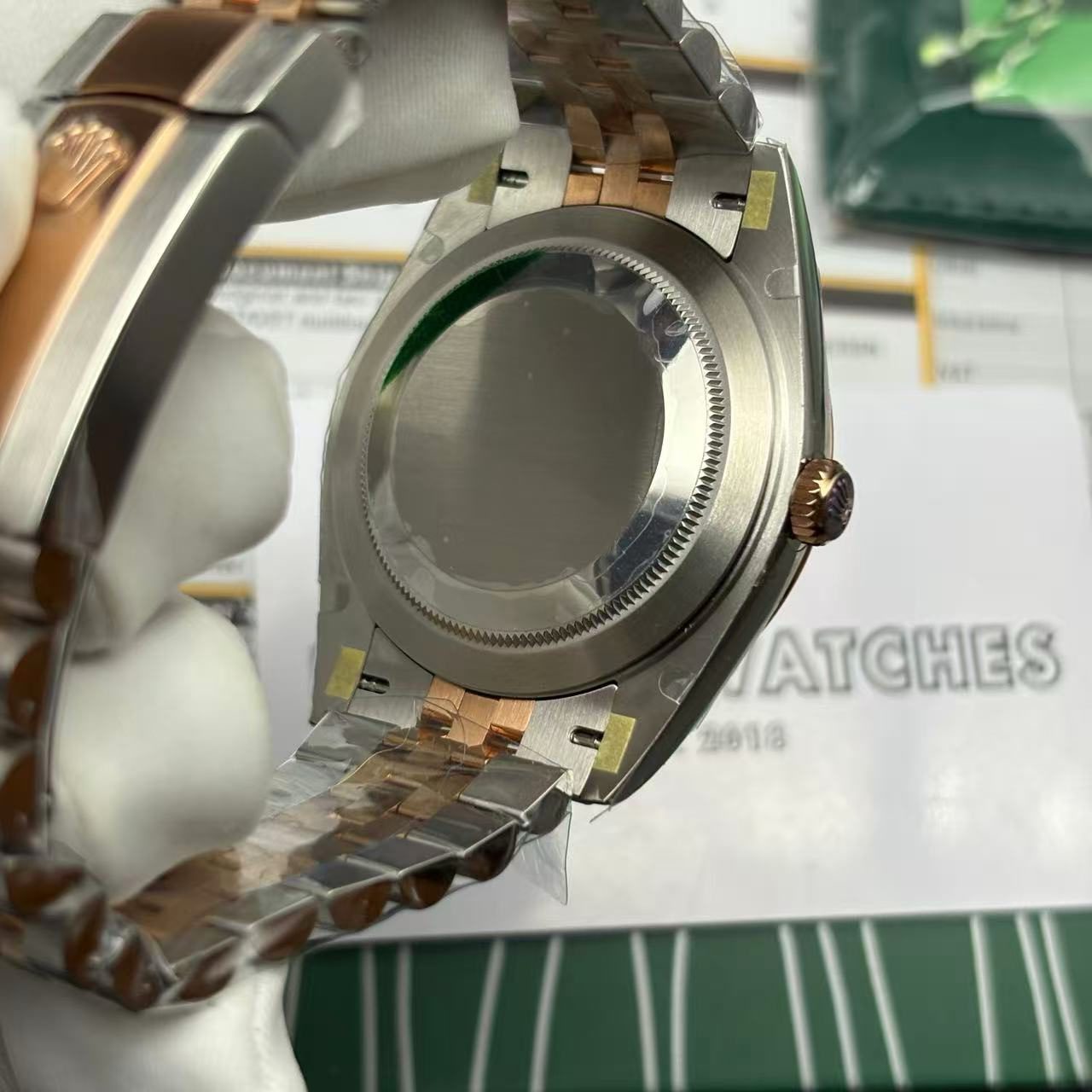 The bracelet, styled in the iconic Jubilee fashion and fabricated from 904L stainless steel, wraps around your wrist with refined sophistication. It’s adjustable, promising a comfortable and secure fit. The folding clasp, also crafted from 904L stainless steel and adorned in rose gold, ensures ease of use while maintaining a striking visual appeal. The Rolex Datejust 126331 features an array of meticulously replicating details, including arrant serial numbers and cards, font precision, punto, and exquisite finishing for all writings and markings. These features make it almost indistinguishable from the original, providing you with all the luxury at a fraction of the cost.