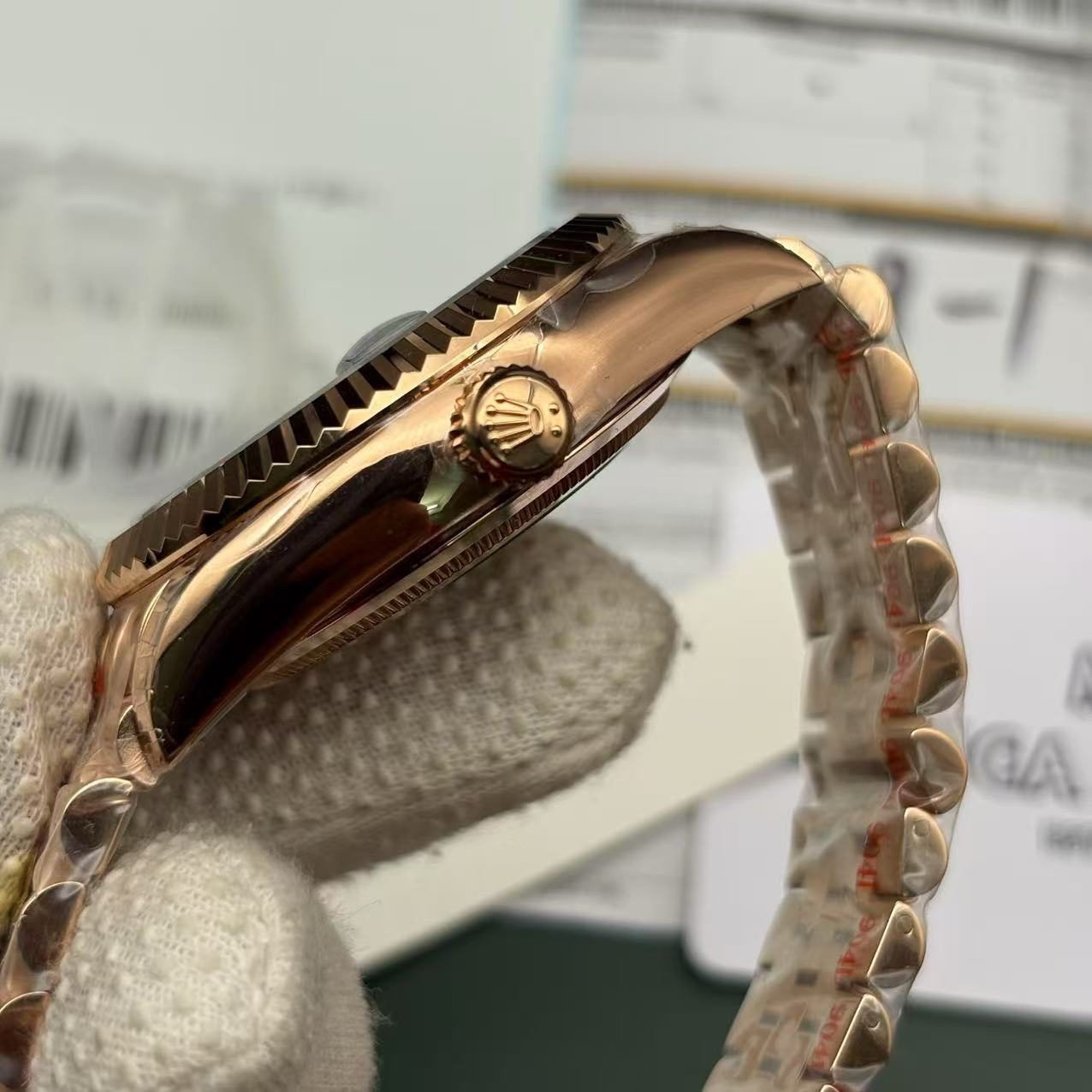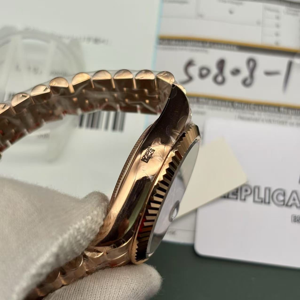 Crafted for those who appreciate both beauty and performance, this Rolex watch replica showcases a robust 14.10 mm thick case that protects its intricate inner workings. Clean lines and a sparkling sapphire crystal protect the dial, offering a clear view of the 904L stainless steel stick hands which march with precision. The adjustable Oyster bracelet, also made of rose gold 904L stainless steel, ensures that this piece sits comfortably and securely on the wrist, making it a practical choice for daily wear or special occasions.