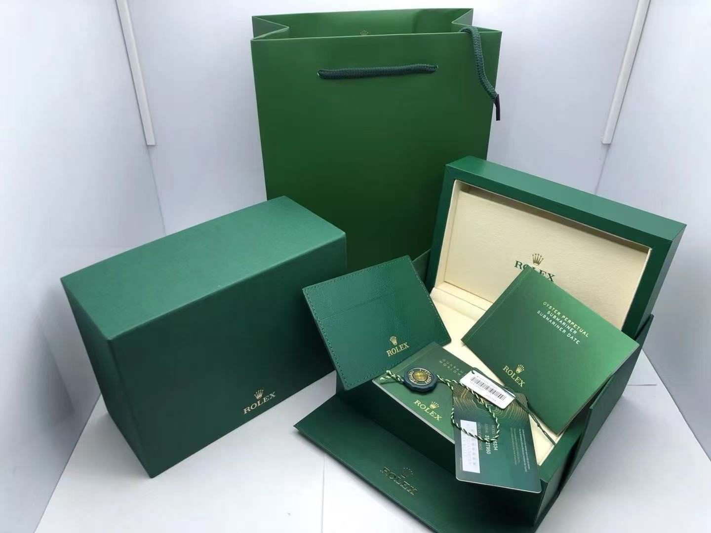The set includes the outer cardboard box, inner green leather-style box, official-style papers, and a customizable Rolex warranty card. For 2025, this version improves finishing details with sharper embossing, upgraded stitching, and a more authentic leather texture. The warranty card can be custom printed with your name, date of purchase, or personalized text, adding an exclusive touch.